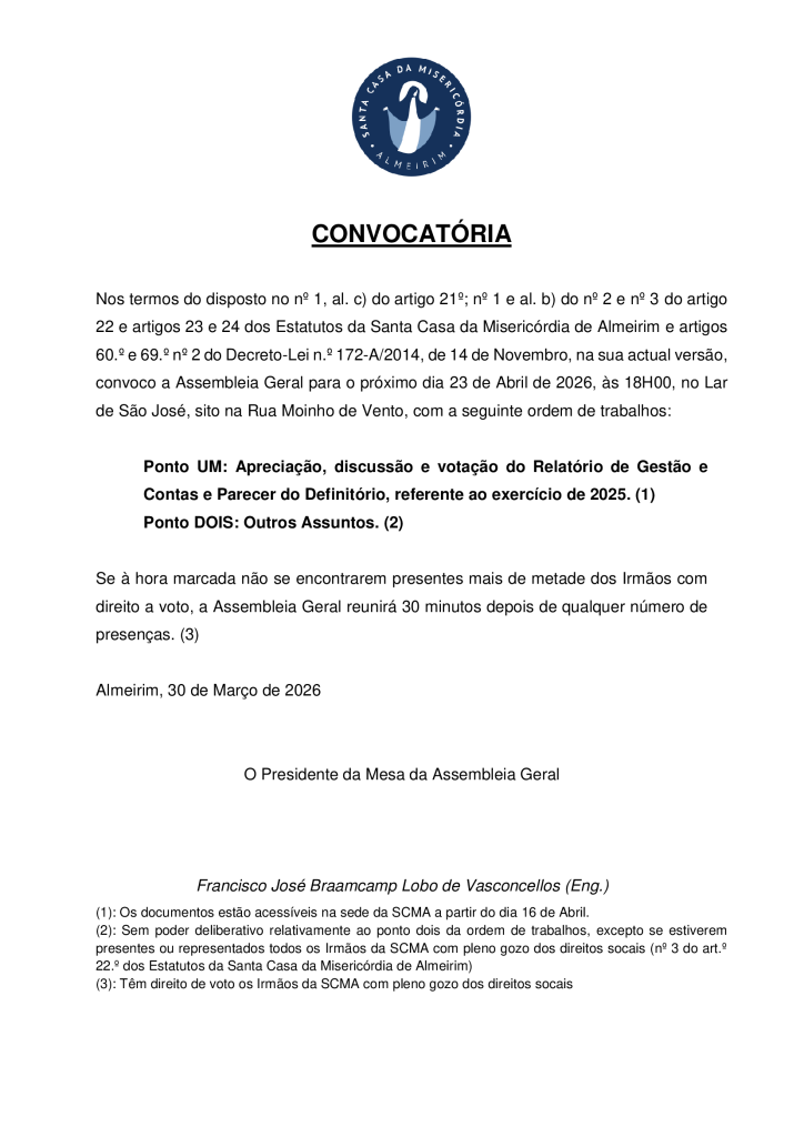 Nos termos do disposto no nº 1, al. c) do artigo 21º; nº 1 e al. b) do nº 2 e nº 3 do artigo 22 e artigos 23 e 24 dos Estatutos da Santa Casa da Misericórdia de Almeirim e artigos 60.º e 69.º nº 2 do Decreto-Lei n.º 172-A/2014, de 14 de Novembro, na sua actual versão, convoco a Assembleia Geral para o próximo dia 23 de Abril de 2026, às 18H00, no Lar de São José, sito na Rua Moinho de Vento, com a seguinte ordem de trabalhos: